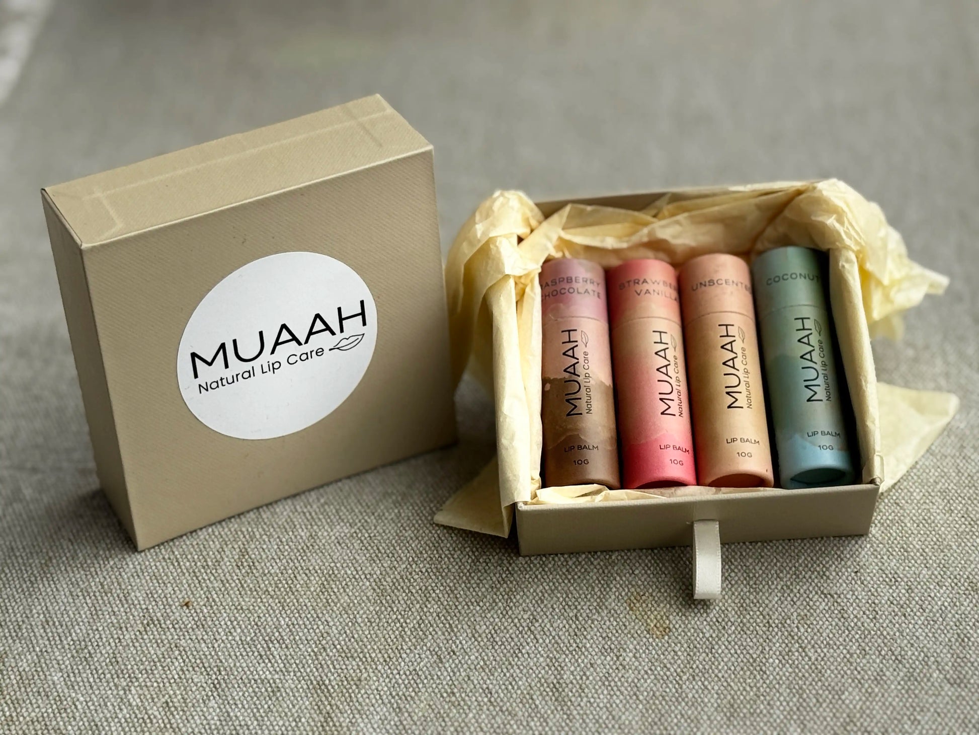Tämä kaunis lahjapakkaus sisältää neljä täysin luonnollista huulirasvaa, jotka hoitavat, kosteuttavat ja suojaavat huulia luonnonmukaisesti – kolme ihastuttavaa tuoksua ja tuoksuton.